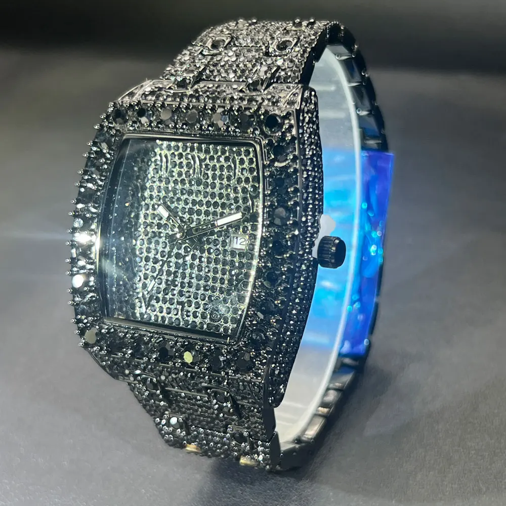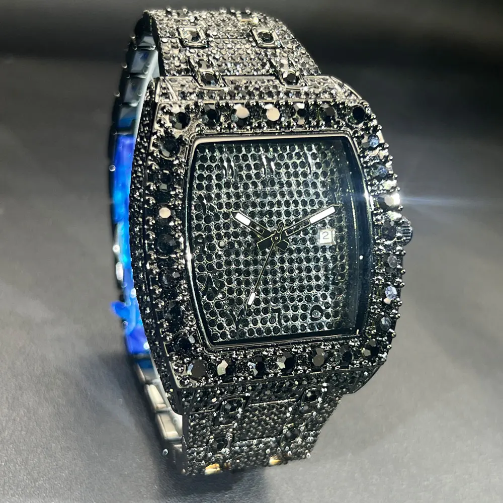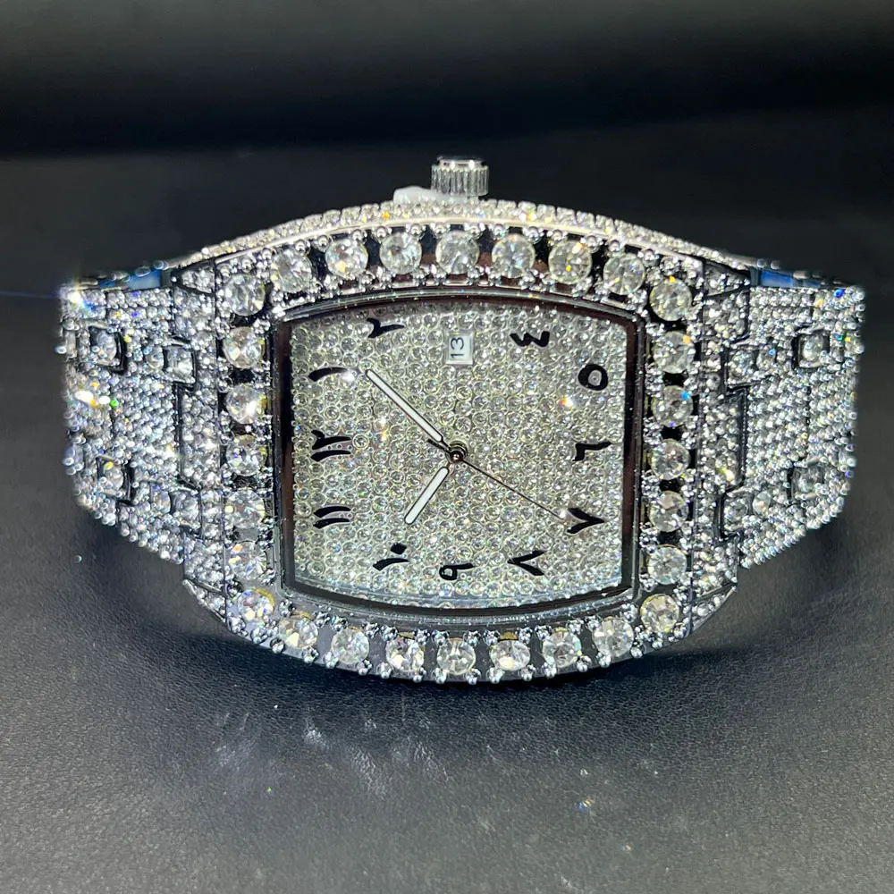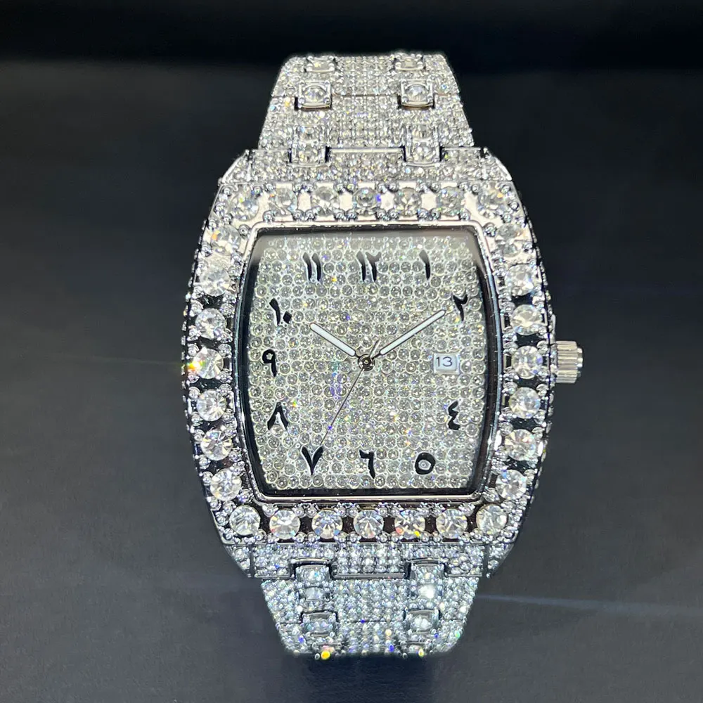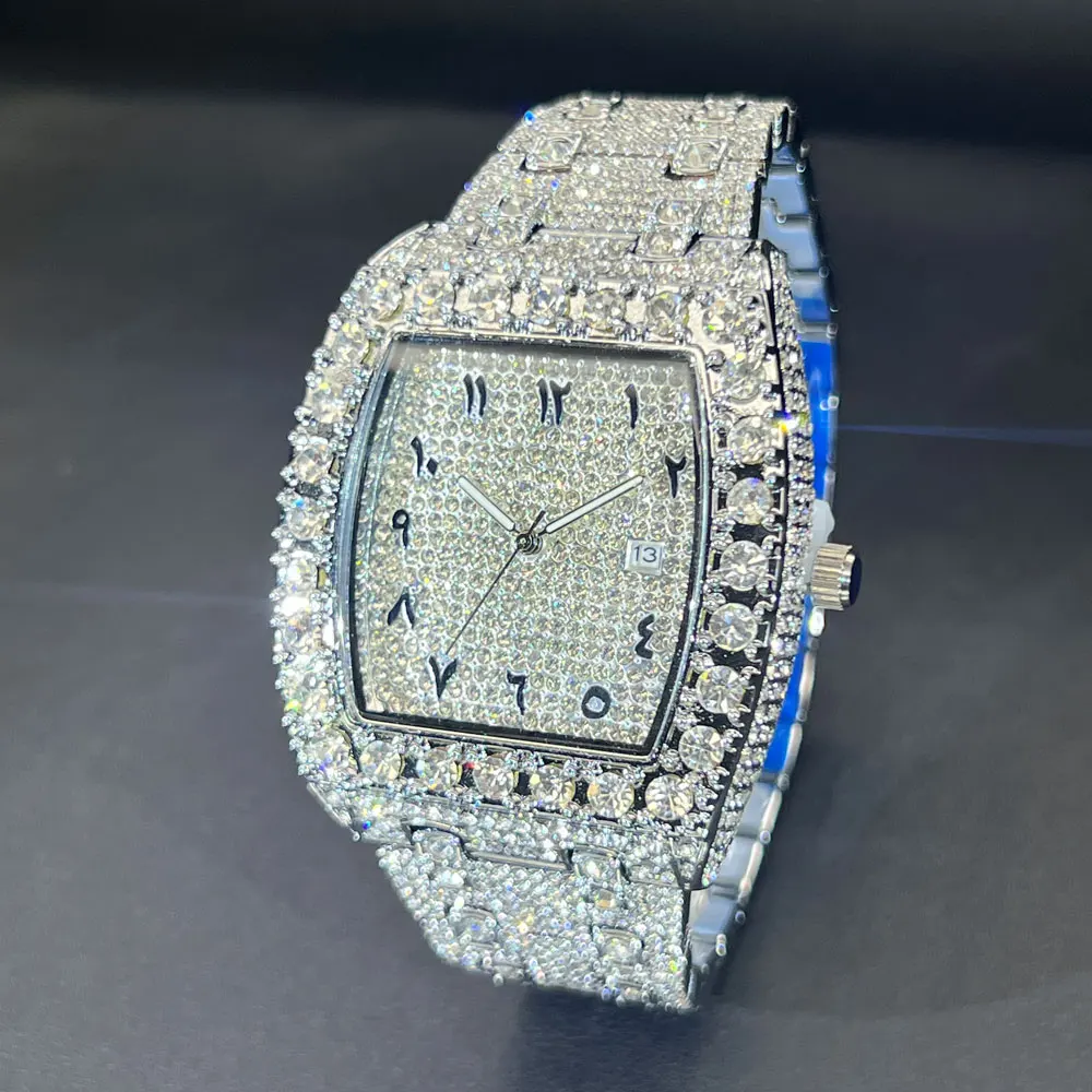 Luxury Iced Out Watch for Mens Brand MISSFOX Hip Hop Square Diamond Quartz Watch Fashion Sports Silicone Strap Tonneau Clock Man