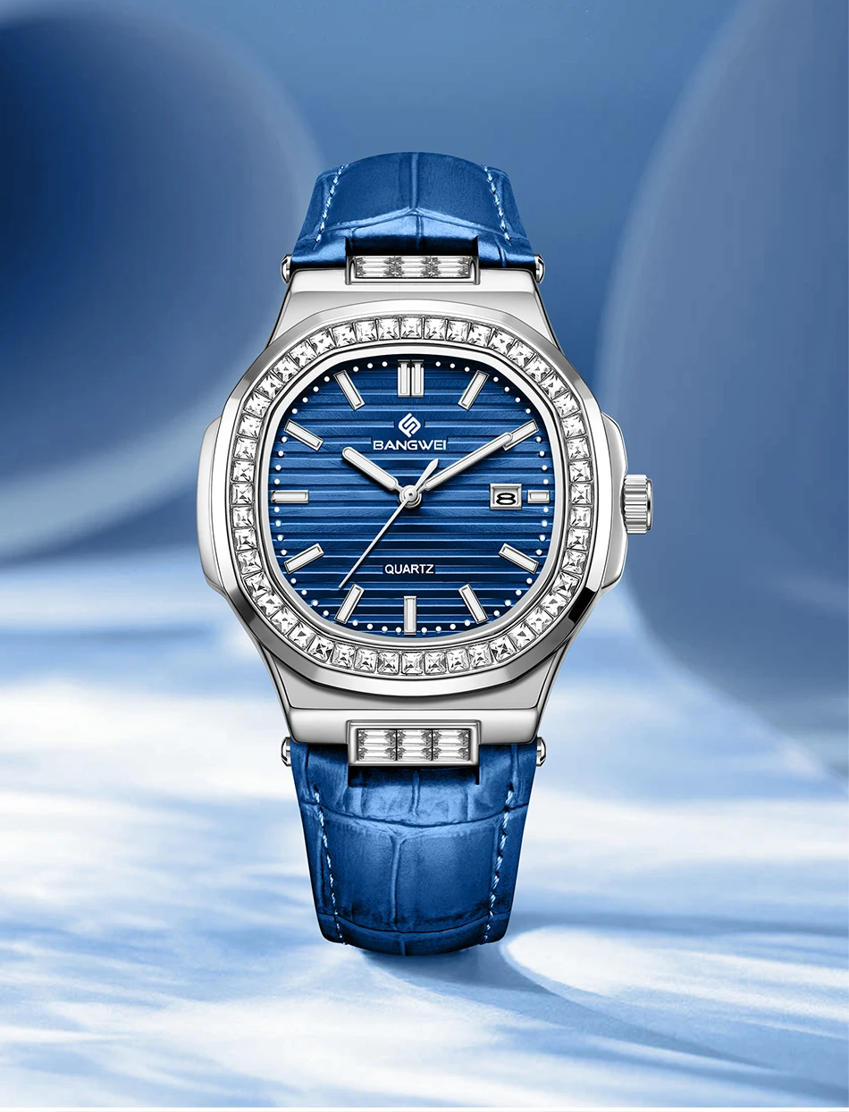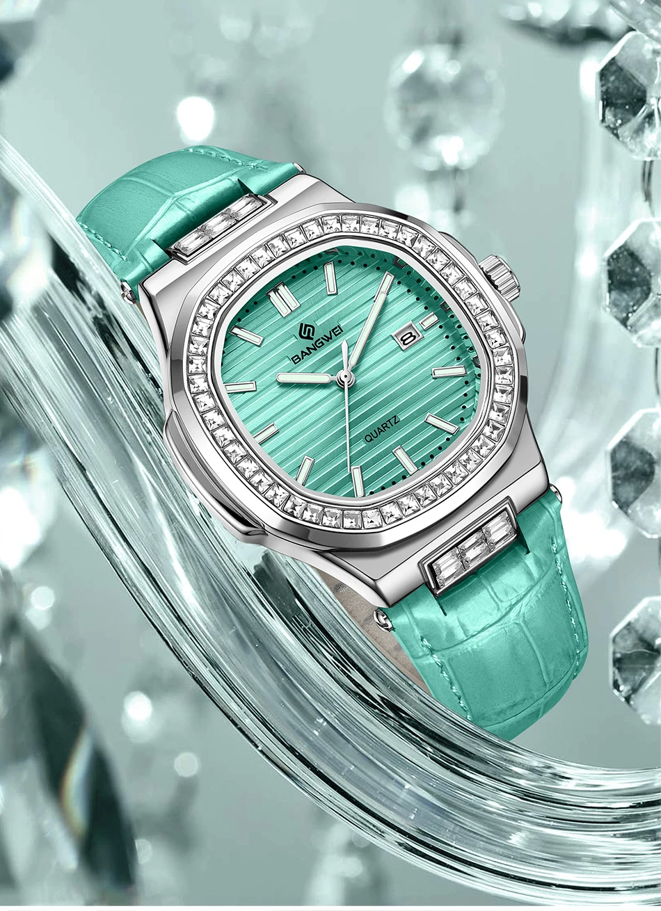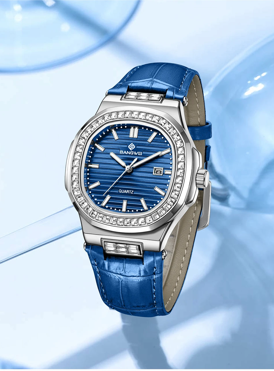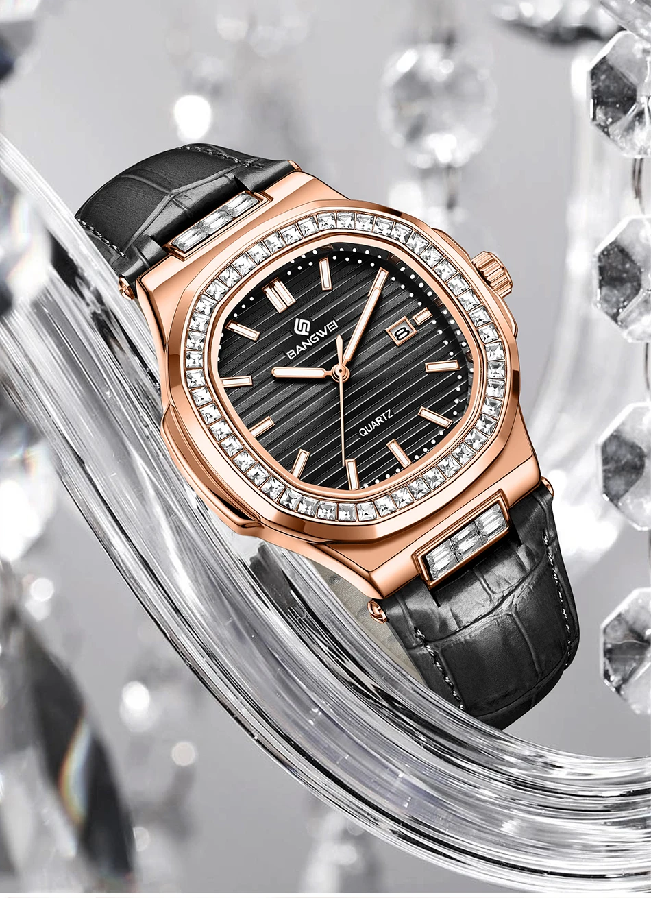 New Fashion BANGWEI Elegant Luxury Quartz Woman Watch Simple Dial Diamond Retro Leather Date Waterproof Luminous Women's Watches